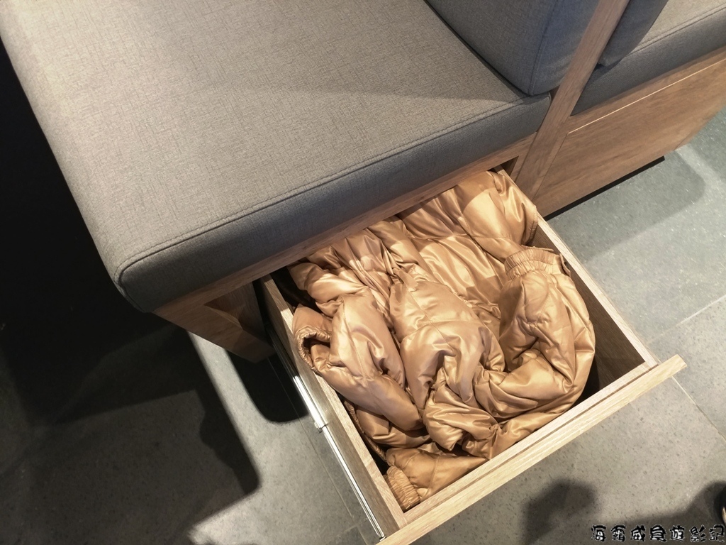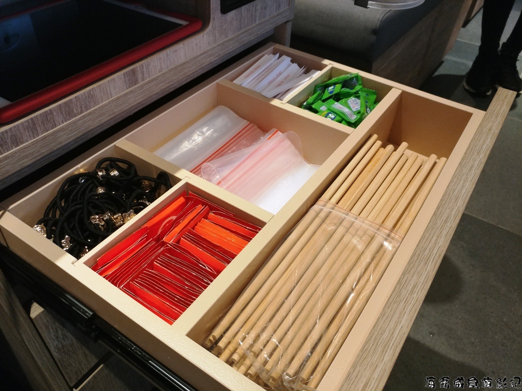 桌子下方與其它分店相同,有各式的備品比較特別的是京站店在座椅下方還有設有滑動式的抽屜可擺放包包與外套,充分利用空間,真的很方便,也不用擔心外套吸附特有的火鍋味